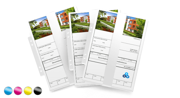 Diese Faltung entspricht DIN 824-B, linksseitig mit einem 15 mm breiten Abheftstreifen aus PVC inklusive 2-fach Lochung. Diese stabile Ausführung ist üblicher Standard und erspart herkömmliche, rückseitige Lochverstärkung und verhindert das Ausreißen bei Lochungen.